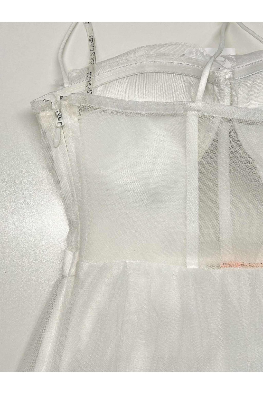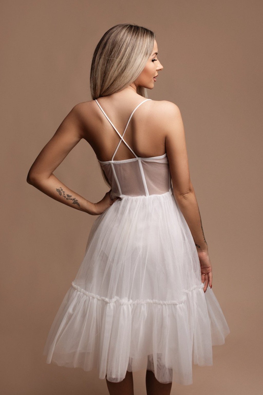 Tyto magické šaty z vás vykouzlí šarmantní dámu s velkou dávkou elegance a noblesy. Průsvitný tyl rafinovaně odhalující pas dodává šatům nepřehlédnutelnost. Na boční straně se zapínají zipem a na prsou jsou vyztužené.