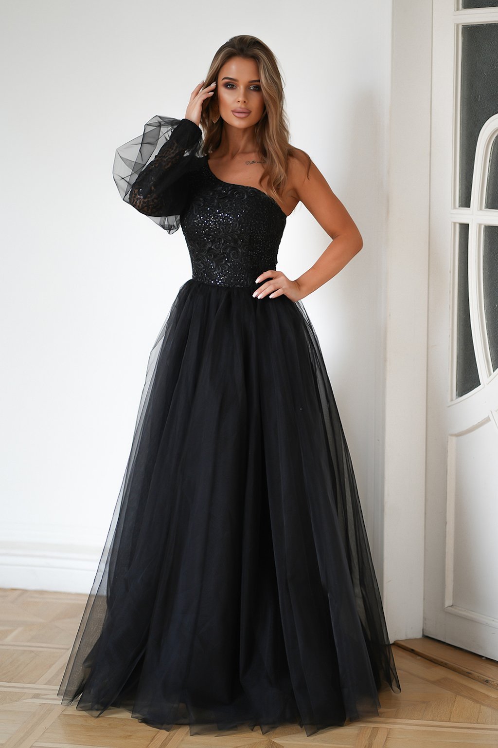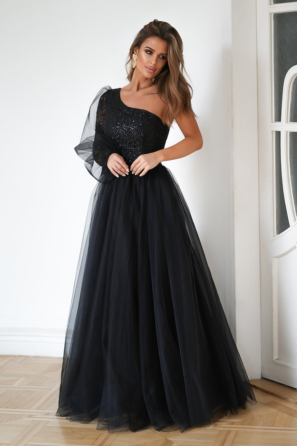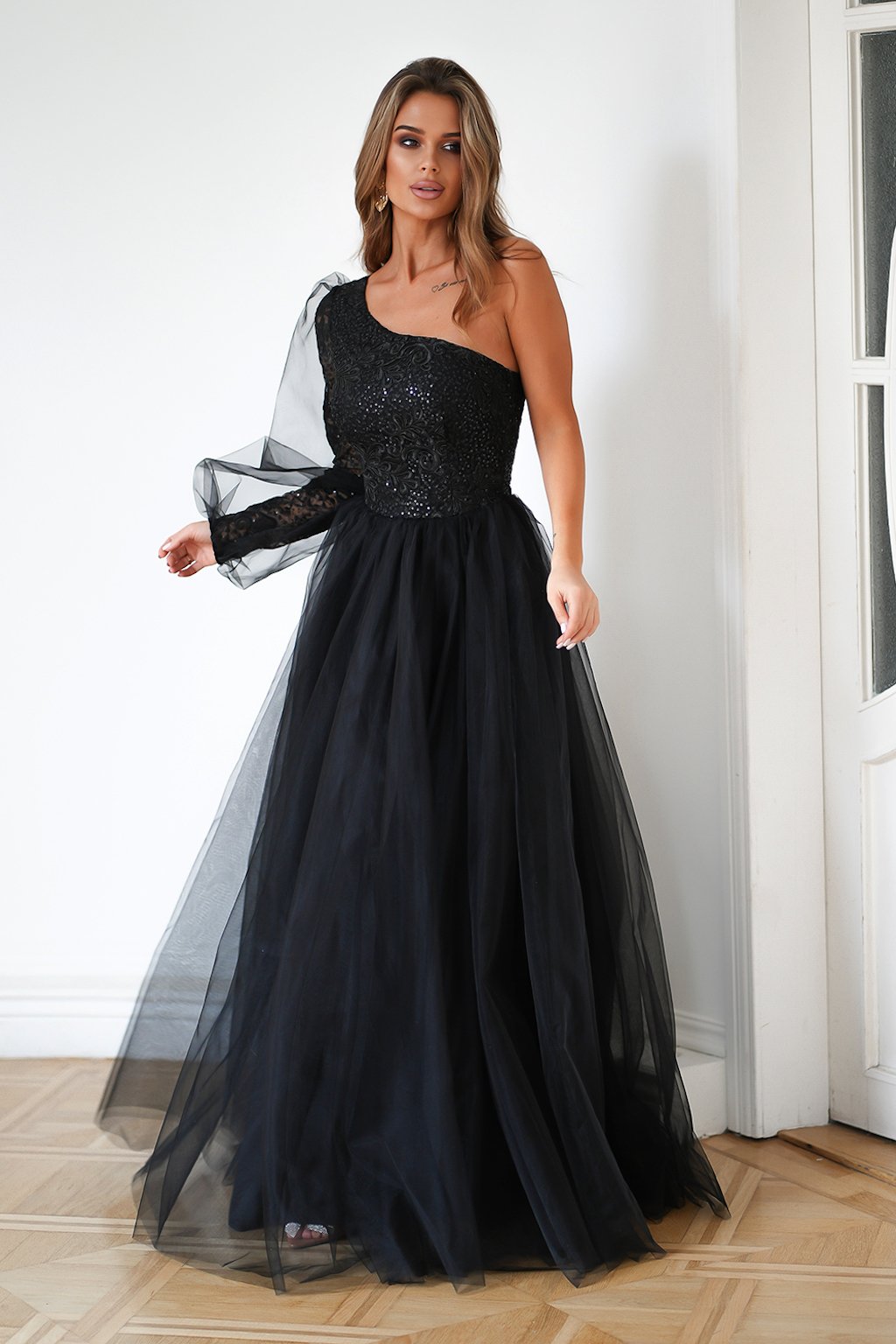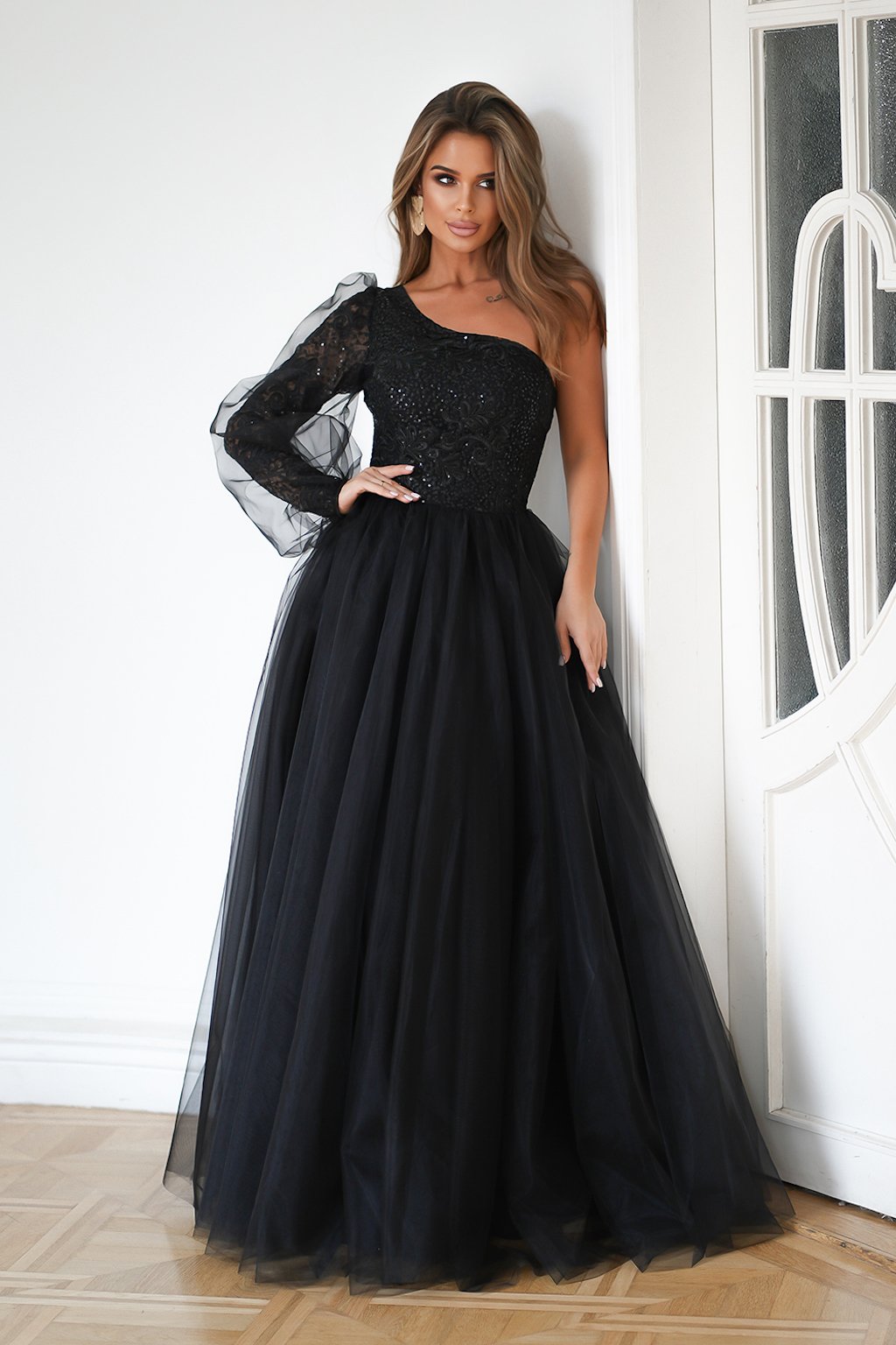 Nadýchaná sukně, romantická krajka a zahalená ruka do tylu – tyto nepřehlédnutelně krásné šaty vás přenesou do světa pohádek az vás vykouzlí kouzelnou královnu. Na společenské události se za vámi ponese závan noblesy, elegance a ženskosti. Vzadu se šaty zapínají zipem.