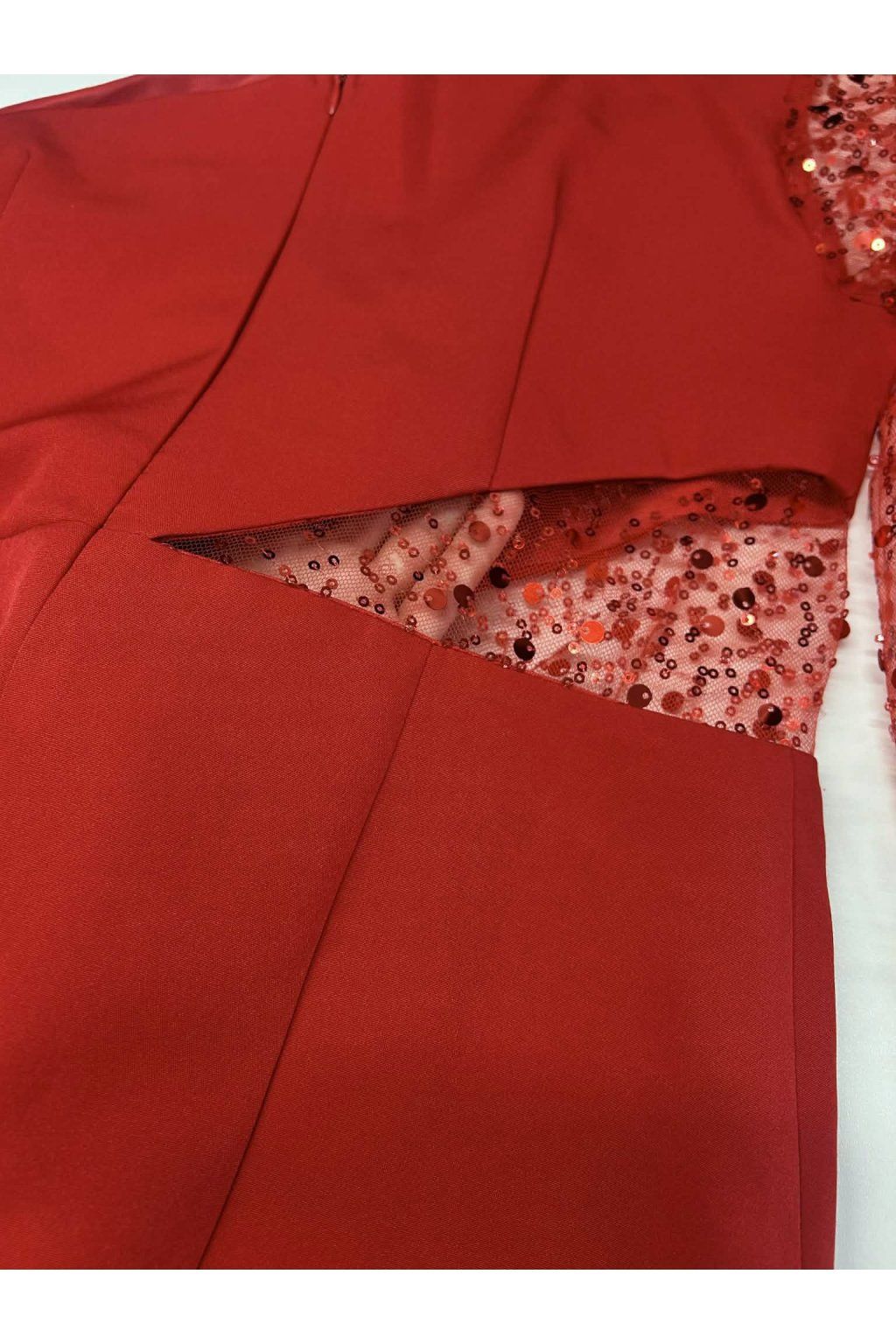 Poškozené zboží - Červené přiléhavé šaty se třpytivým rukávem