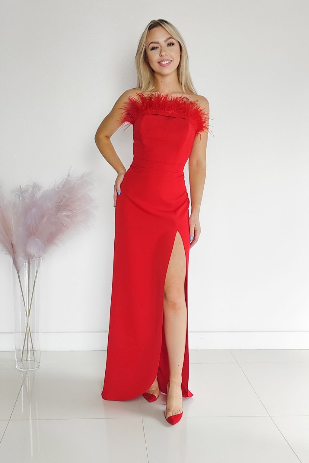 Pro milovnice nápadných kousků jsou tyto šaty jako stvořené. Poutavými je dělají pírka, která zdobí odhalený dekolt a rozparek se postará o sexy krok. Vzadu se šaty zapínají zipem.