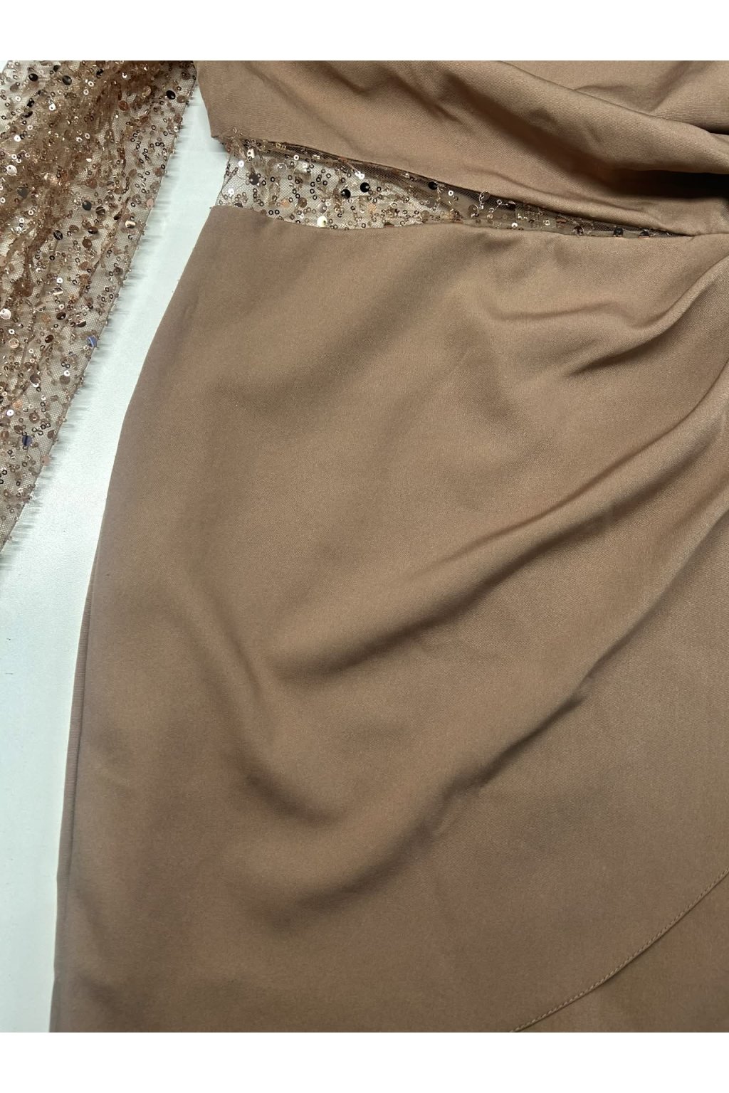 Poškozené zboží - Hnědé krátké šaty se třpytivým rukávem