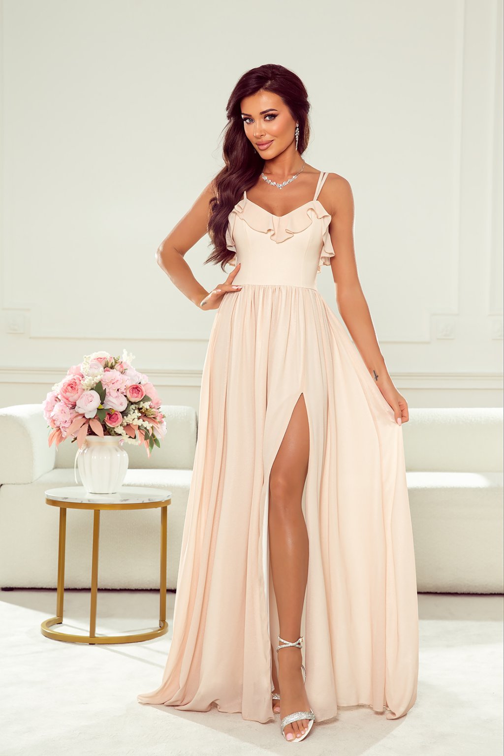 Poškozené zboží - Krémové šifonové šaty s rozparkem a volánky