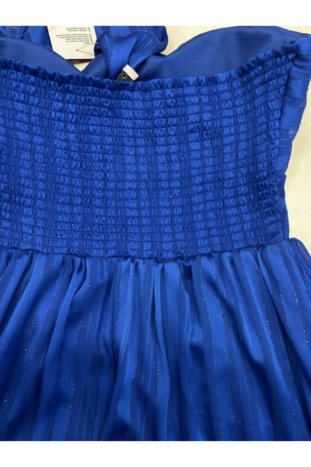 Krásné romantické šaty z vás vykouzlí okouzlující dámu. Jemně lesklý materiál a možnost vázání na různé způsoby dělají tyto šaty nepřehlédnutelnými. Šaty jsou na prsou vyztužené a na zádech jsou prošívané gumičkami.