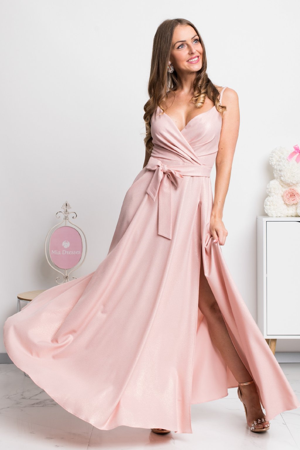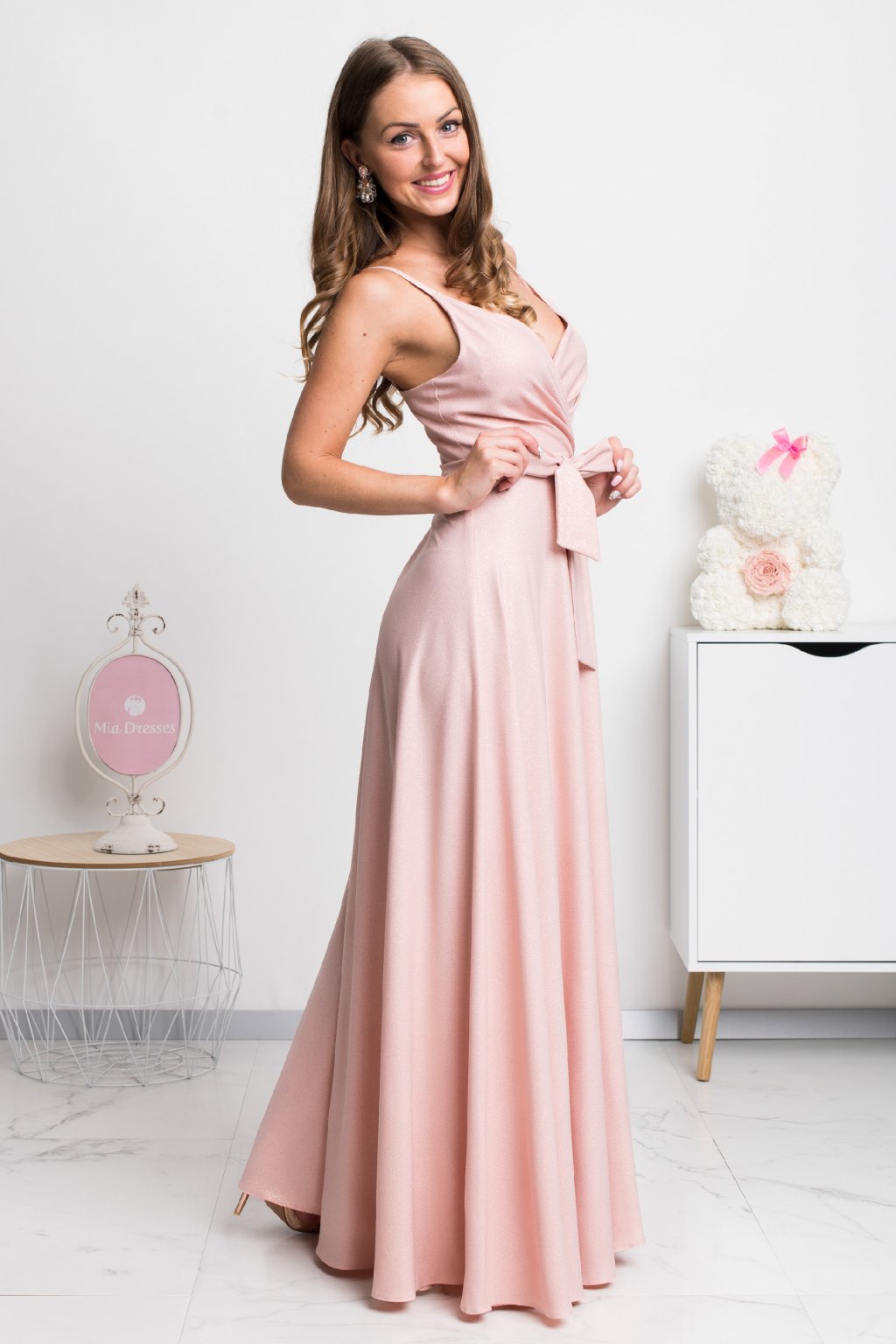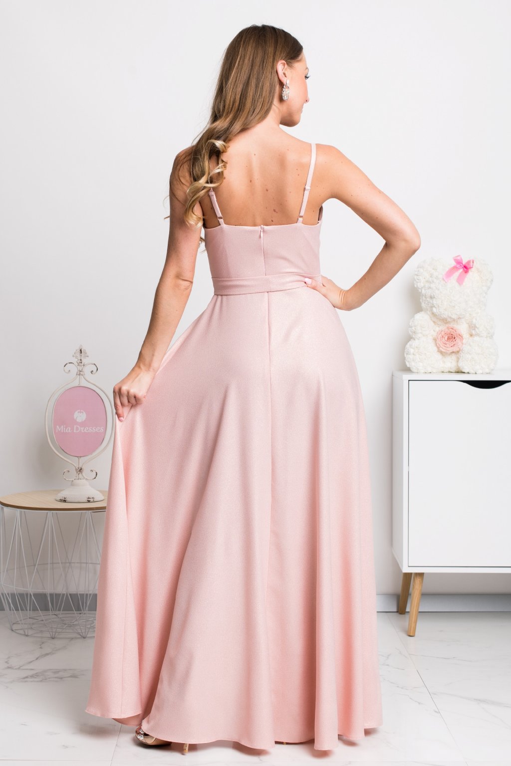 Poškozené zboží - Pudrové společenské šaty s jemnými flitry