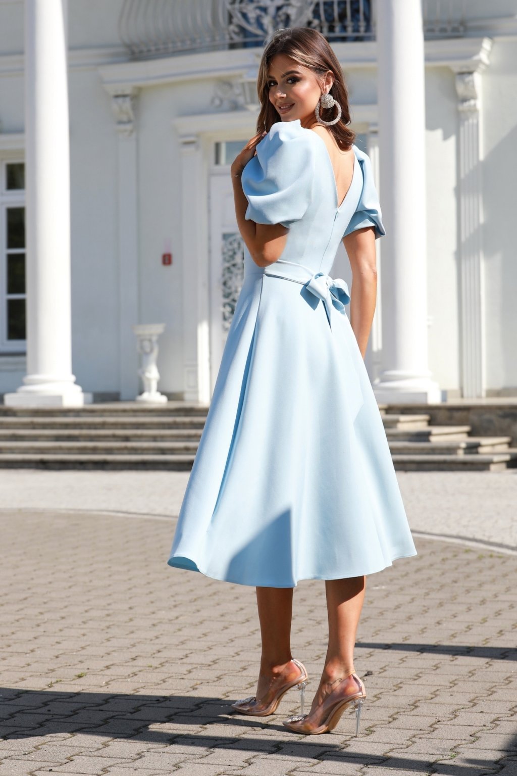 Poškozené zboží - Světle modré midi šaty s balónovými rukávy