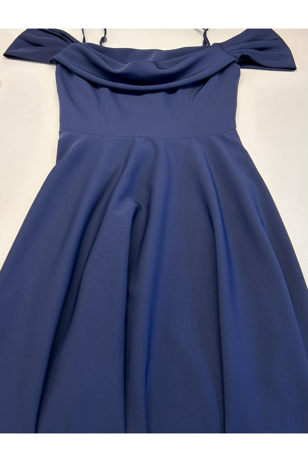 Poškozené zboží - Tmavě modré midi šaty spuštěné na ramena