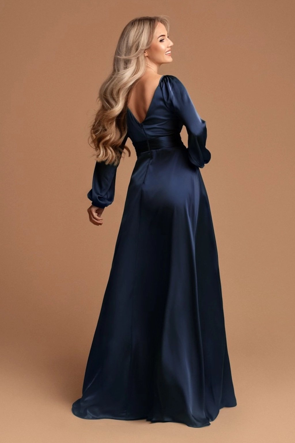 Poškozené zboží - Tmavě modré saténové šaty s rozparkem
