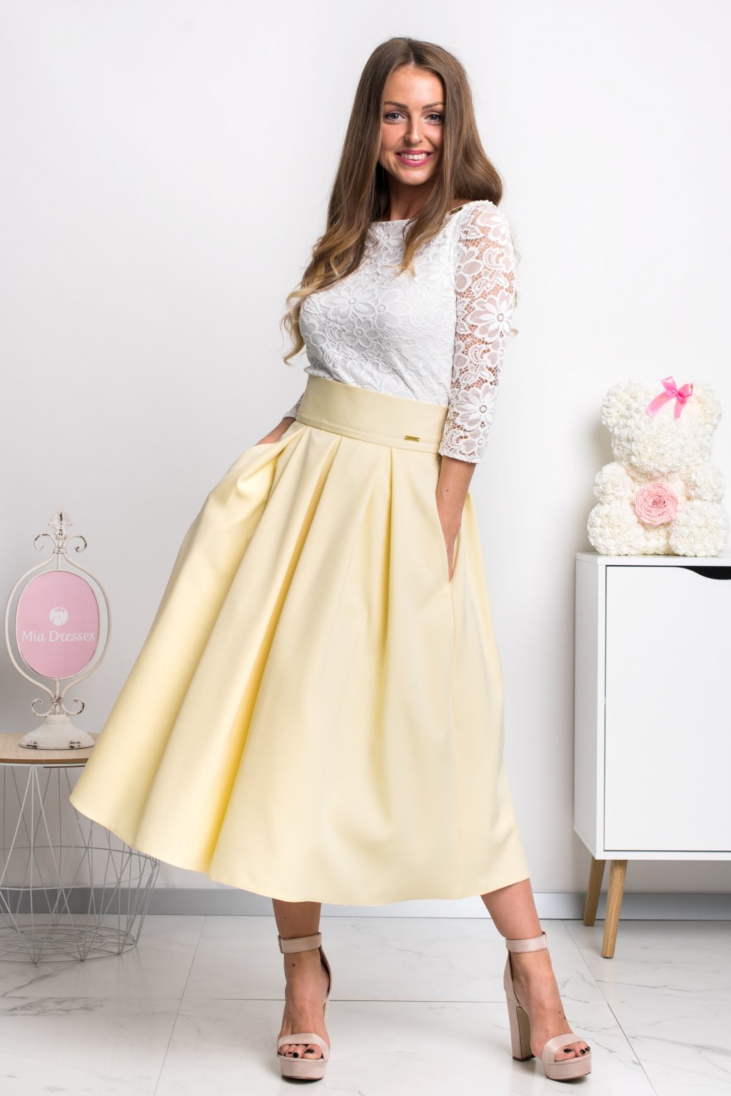 Jednoduchá, ale zároveň originální midi sukně je kousek, který by měla mít každá žena v šatníku. Krásně si drží áčkový tvar díky spodničce, na které je našitý tyl. Tato sukně se stane vaším milovaným kouskem, hodí se ke spoustě příležitostí a svou praktičností vás dostane. Má vyšší pas, který schová všechny nedokonalosti, podtrhne ženské křivky a vytvaruje štíhlejší pas. Vzadu se zapíná zipem, materiál je příjemný, hladký.