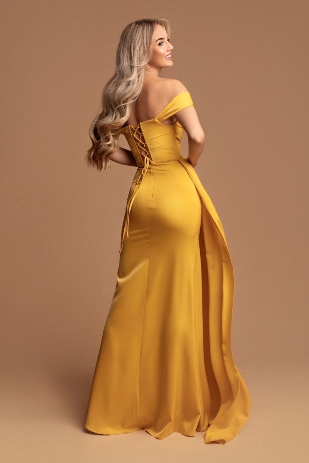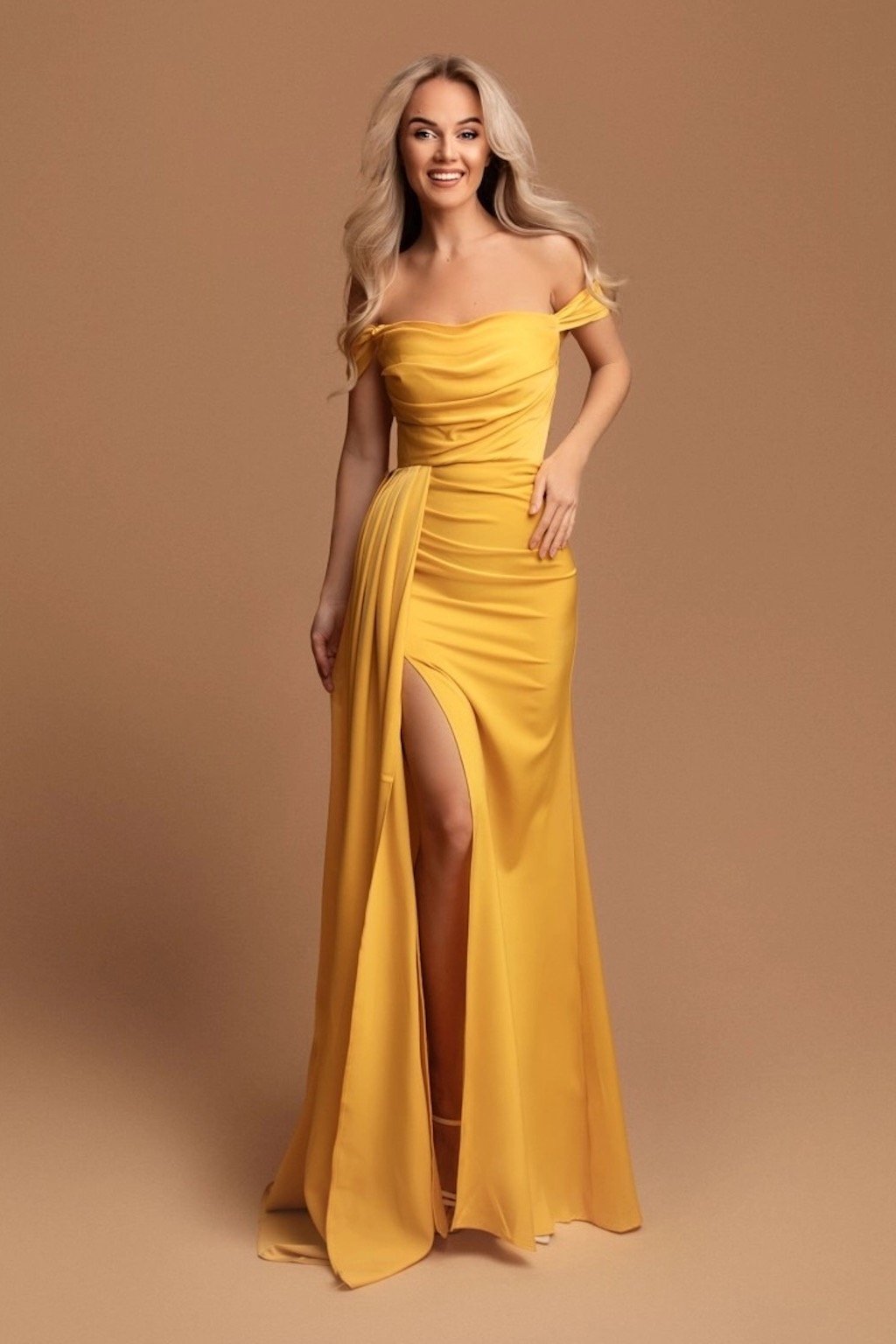 Poškozené zboží - Žluté přiléhavé šaty spuštěné na ramena
